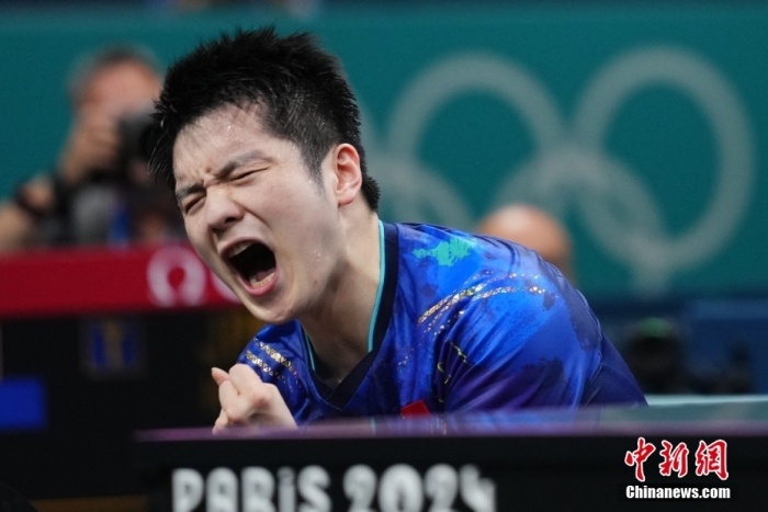 當地時間8月1日,在巴黎奧運會乒乓球男子單打1/4決賽中,中國選手樊振東以4:3勝日本選手張本智和。圖為樊振東慶祝勝利。中新社記者 趙文宇 攝