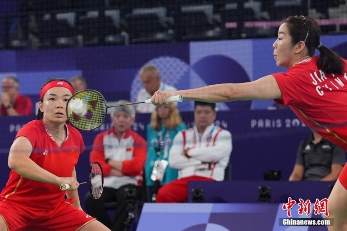 當地時間8月1日,陳清晨/賈一凡(右)在比賽中。當日,在巴黎奧運會羽毛球項目女子雙打1/4決賽中,中國組合陳清晨/賈一凡2比0戰勝保加利亞組合加夫列拉/斯蒂法尼,晉級半決賽。中新社記者 趙文宇 攝