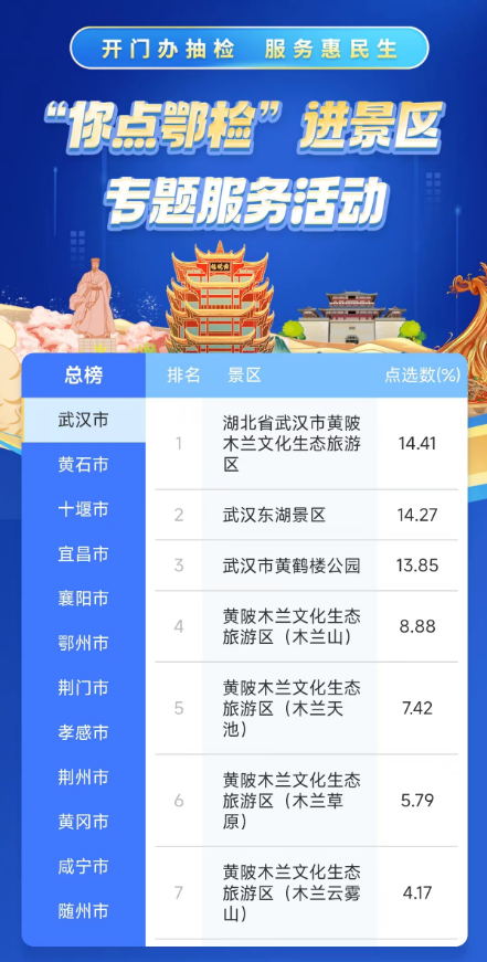 數(shù)據(jù)顯示,7月26日-8月1日期間,活動總訪問量1332687,累計702557人次參與,點選總票數(shù)達2560005票。其中,黃陂木蘭文化生態(tài)旅游區(qū)、武漢東湖景區(qū)、黃鶴樓公園、襄陽唐城景區(qū)、三峽人家景區(qū)、武當山風景區(qū)等排名靠前。