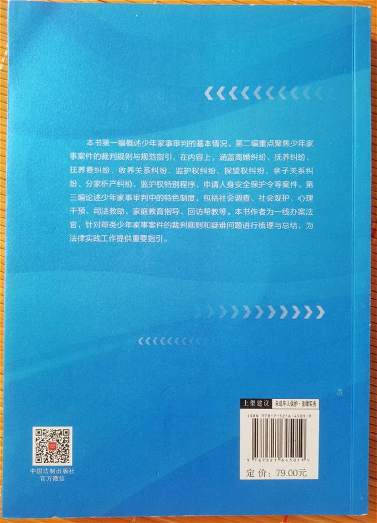 該書分為少年家事案件特點和類型、少年家事案件的裁判規則與規范指引、少年家事審判的特色制度等三篇,共18章,26.1萬字。該書系統地介紹了少年家事審判工作的基本原則、典型案例,以及應該從嚴把握的實用方法、發展方向,為廣大司法審判工作者提供了較專業的司法裁判指引。