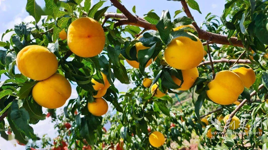 青年志愿者們依次走入黃桃基地,滿山的桃樹郁郁蔥蔥,金黃的黃桃掛滿枝頭,微風拂過,桃香四溢,讓人不禁垂涎欲滴。