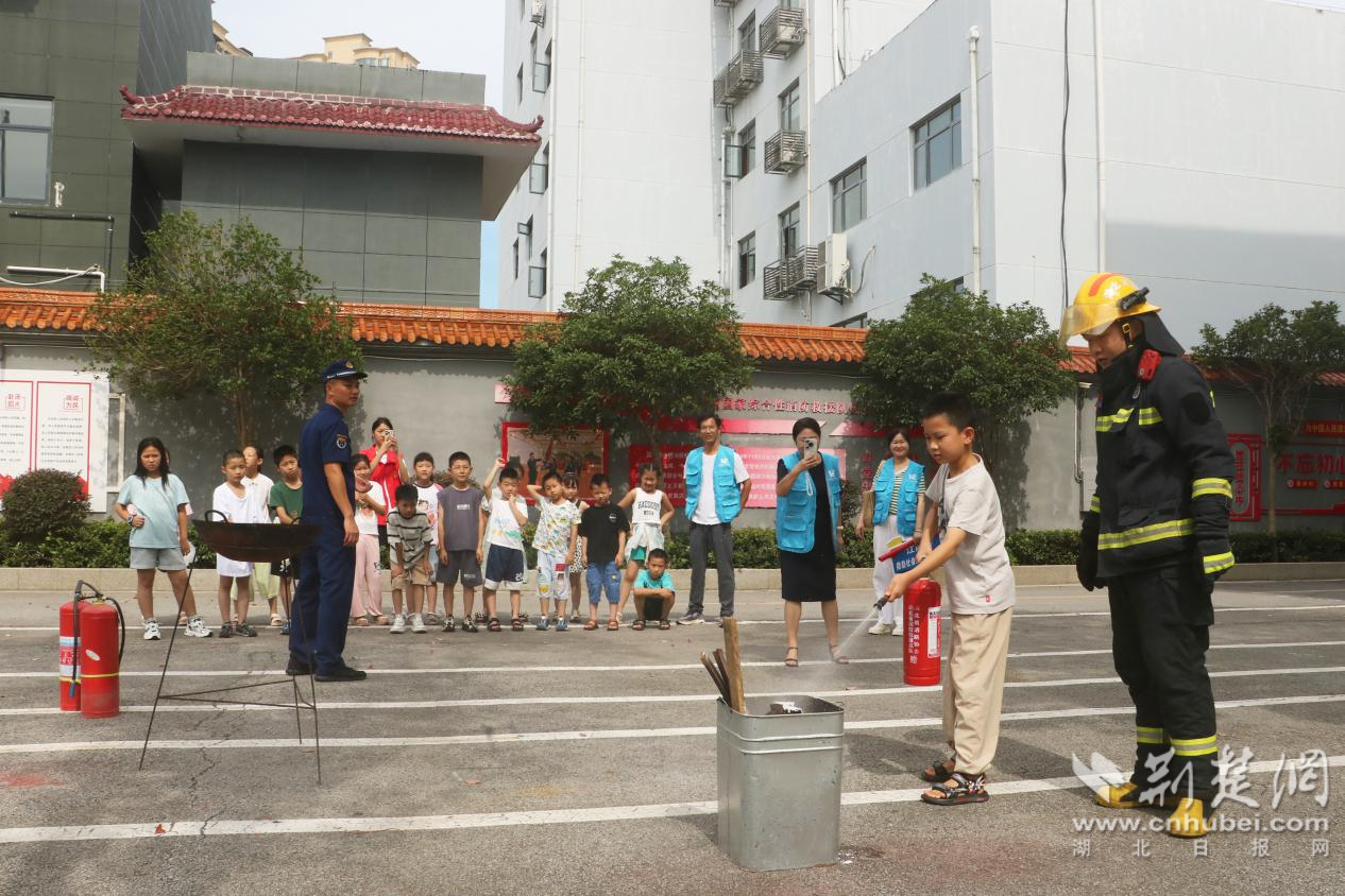 (江陵縣“暑假學堂”愛心托管班學生實操滅火器 攝影:陳園)
