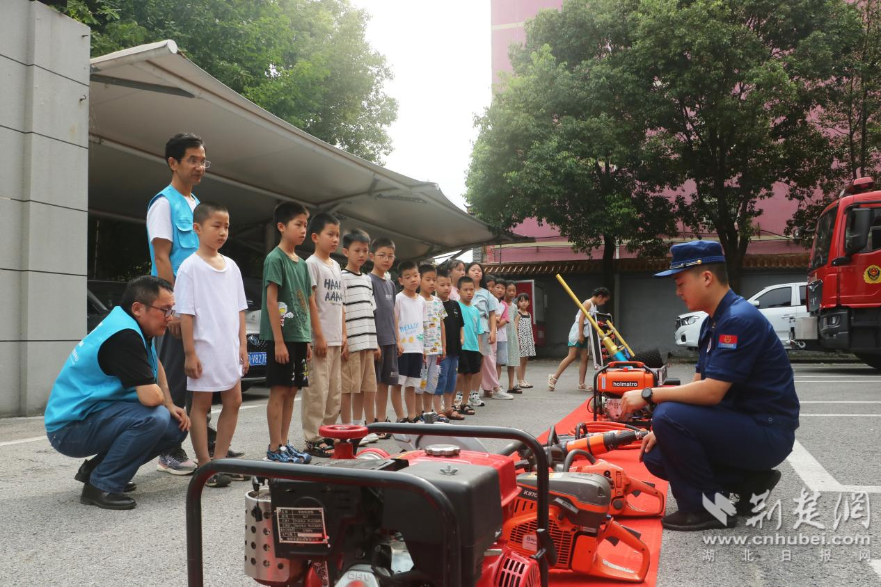 在江陵縣消防救援大隊,“暑假學堂”愛心托管班的小朋友們一走進消防站,就被體型龐大的消防車吸引住,“哇!這些消防車好高大,以前都是在電視機和書上才看到。”消防救援人員采取互動提問的形式,介紹了每輛消防車的功能和用途以及消防車里的各種神奇工具,在“藍叔叔”的幫助下,小朋友穿上消防服,變身“小小消防員”。