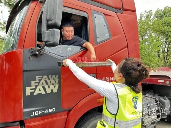 在孝感東收費站、楊店收費站活動現場,志愿者們頂著烈日,面帶微笑將精心準備的西瓜、礦泉水、藿香正氣水等消暑物資逐一送到貨車司機手中。“真是太及時了,這西瓜吃得我整個人清爽多了!”貨車司機馮師傅接過志愿者遞過來的西瓜,滿臉笑意地豎起了大拇指。