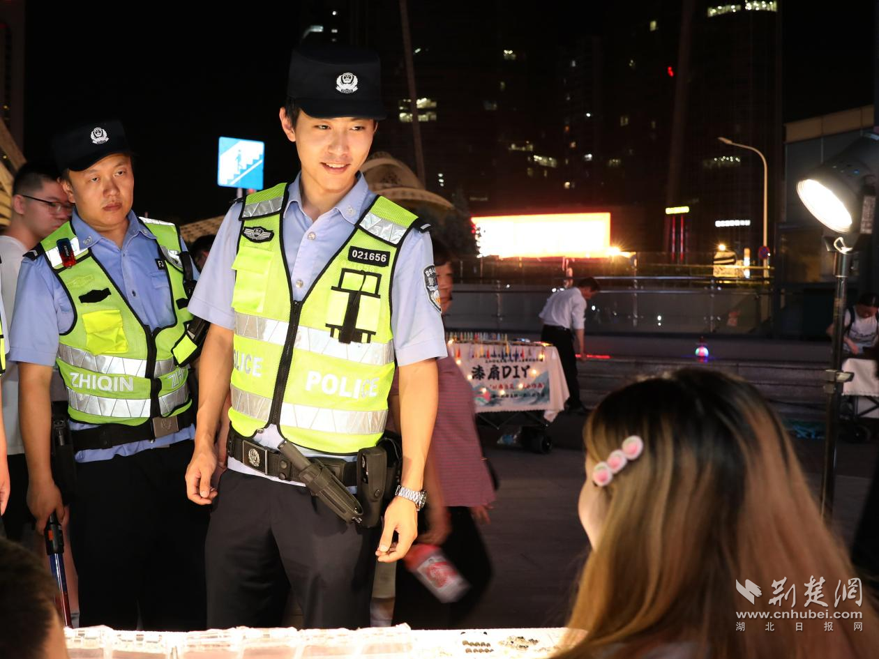 夏夜時分,華燈初上。夜市里,各類小攤陸續出動,一字排開,霓虹燈牌閃爍,煙熏火燎,吆喝聲、音樂聲,此起彼伏。在如織的人流中,來回穿梭的一抹警察藍格外醒目。“他們每天都守到轉鐘,有他們在,安全感滿滿。”在曙光夜市經營小龍蝦生意的攤主劉師傅說。
