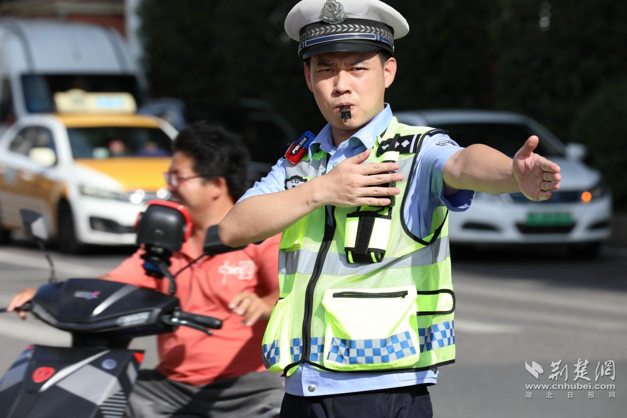 一次次揮動手臂,指揮車輛有序通過,一聲聲安全提醒,保障群眾安全出行。光谷的路面上,交警和巡警堅守陣地,他們的警帽警服濕透了變干,速干后又被浸濕,黑白分明的手臂是他們夏日的“標配”。洗把臉、擦個汗、喝口水。短暫休整后大家再次回到工作崗位,滴灑在馬路上的汗水成了民輔警們辛苦付出的印記。