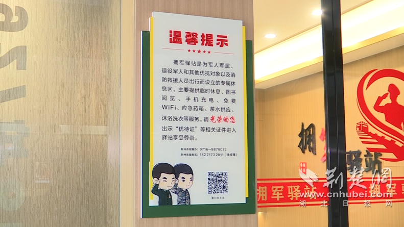 據悉,今年1月,省退役軍人事務廳與湖北交通投資集團簽訂了優待協議,集團下屬的高速公路服務區拿出90個加油站和165個便利店對退役軍人提供優惠優待。此次運行的滬渝高速荊州東服務區“擁軍驛站”將為省內外過往的軍人軍屬、退役軍人、消防救援人對象提供臨時休員和其他優撫息、圖書閱覽、手機充電、免費WiFi、應急藥箱、茶水供應、沐浴洗衣等服務保障。