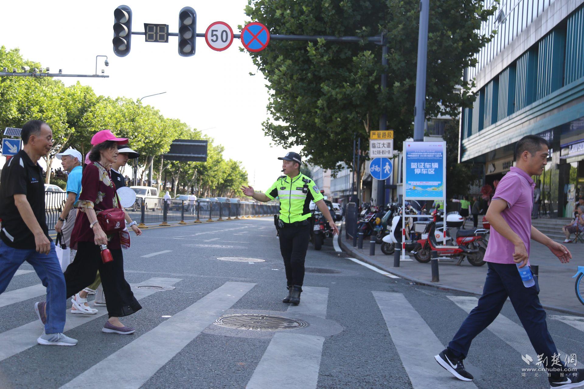 “前方大型活動,請繞行,謝謝配合。”交通大隊漢警快騎中隊長王波正在引導群眾有序通行。