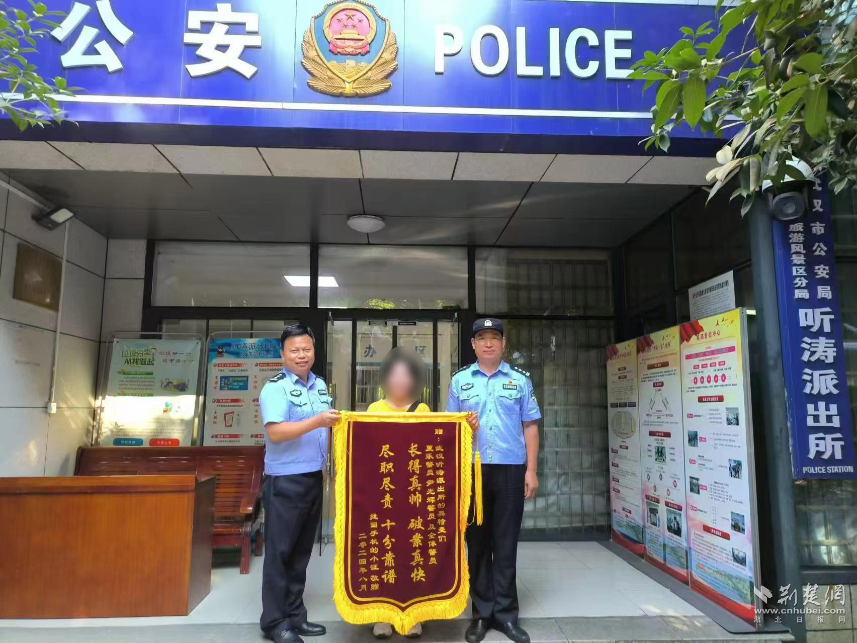 武漢市公安局東湖生態旅游風景區分局聽濤派出所(以下簡稱聽濤派出所)接警民警尹光輝經過對衛生間走廊的監控進行反復對比、細致排查,發現一名女性游客在汪女士離開后不久,手拿兩部手機慌忙離開衛生間,拾取手機的可能性很大。在擴大查找范圍對其一行人員軌跡進行研判追蹤后,民警確認了她的身份。當與該女子取得聯系時,該女子矢口否認撿到手機,于是尹光輝在電話里耐心地做起了普法教育,一番勸說下該女子最終承認撿到手機并歸還了手機。