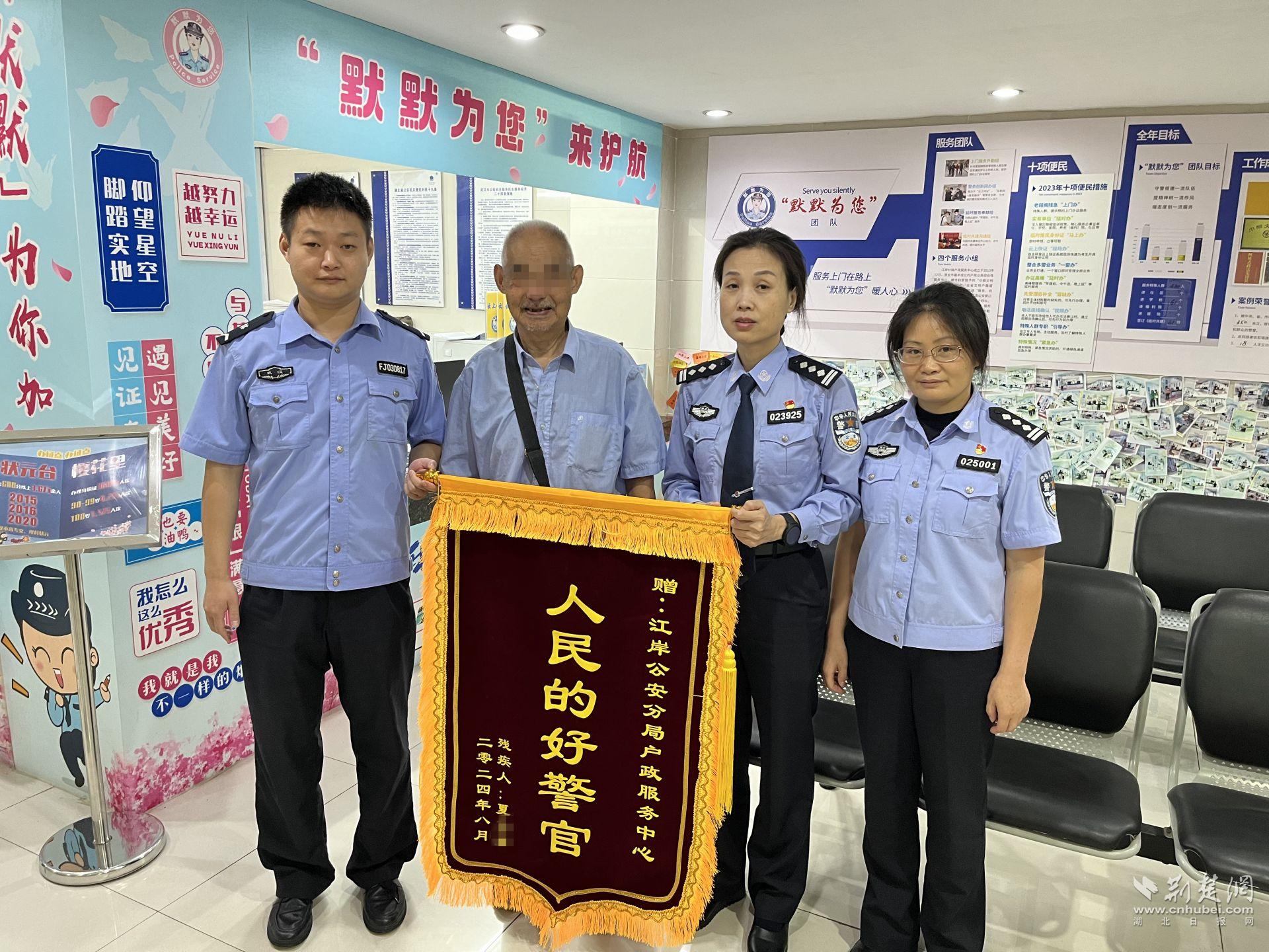 8月9日,84歲的夏爹爹拿著一面“人民的好警官”錦旗蹣跚地走進(jìn)了江岸戶政中心。“很榮幸看到了你們上門(mén)服務(wù)的‘接力賽’,這么熱的天氣,你們接力不停,快速為求助群眾服務(wù),太感謝你們了!” 老人的一番話讓“默默為您”團(tuán)隊(duì)成員備受鼓舞。