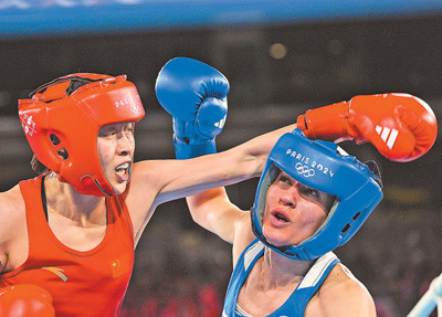 當地時間8月8日,中國隊選手常園(左)在巴黎奧運會女子拳擊54公斤級決賽中。 新華社記者 江文耀攝 |