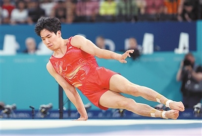 中國選手張博恒在巴黎奧運會體操項目男子自由體操決賽中。 新華社記者 曹 燦攝 |