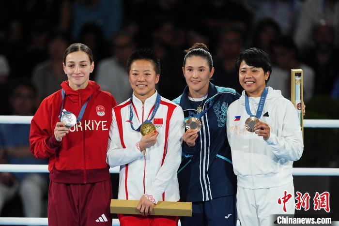 當地時間8月9日,獲獎選手在領獎臺上合影。當日,在巴黎奧運會拳擊項目女子50公斤級決賽中,中國選手吳愉戰勝土耳其選手卡基羅格魯,奪得金牌。 中新社記者 趙文宇 攝