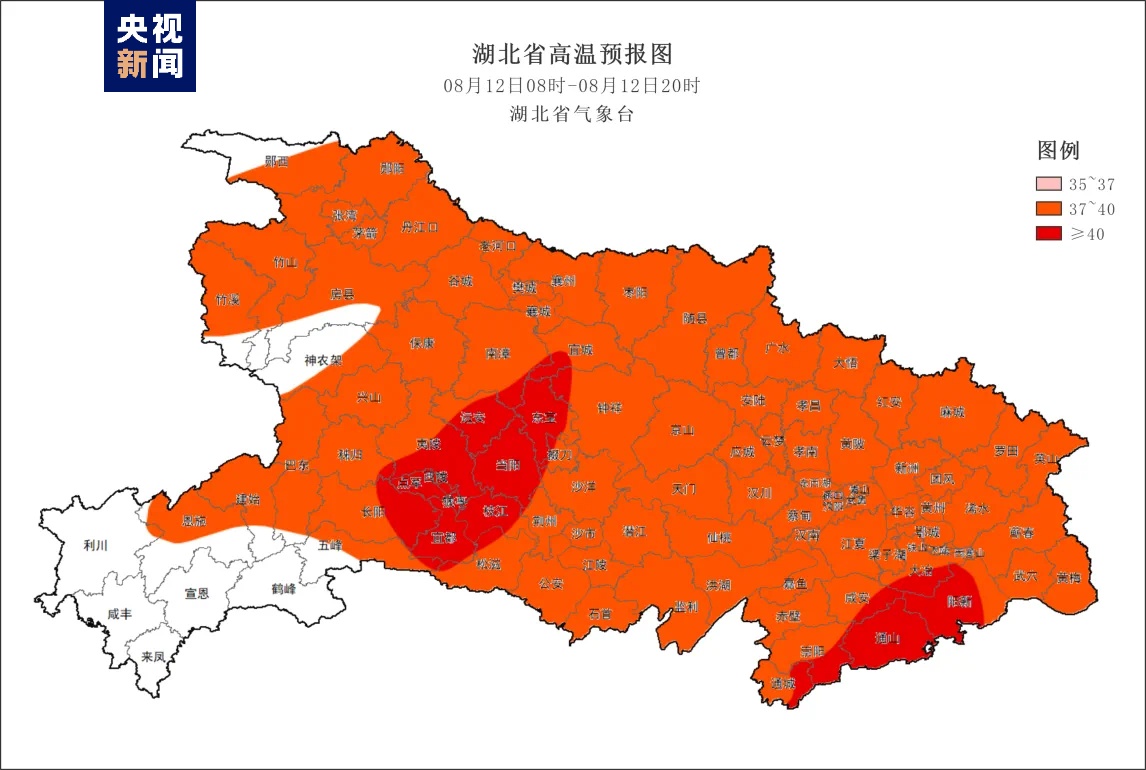 湖北省氣象臺2024年08月11日15時43分發布高溫紅色預警:預計8月12日白天,除神農架、恩施高海拔地區外,全省大部分地區最高氣溫將超過37℃,其中宜昌、襄陽、荊門、咸寧、黃石等部分地區將達40℃以上,公眾外出請注意防范。