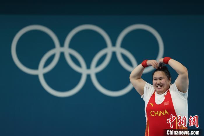 當地時間8月11日,在巴黎奧運會舉重女子81公斤以上級比賽中,中國隊選手李雯雯以抓舉136公斤、挺舉173公斤、總成績309公斤獲得金牌。圖為李雯雯“比心”慶祝勝利。 中新社記者 富田 攝