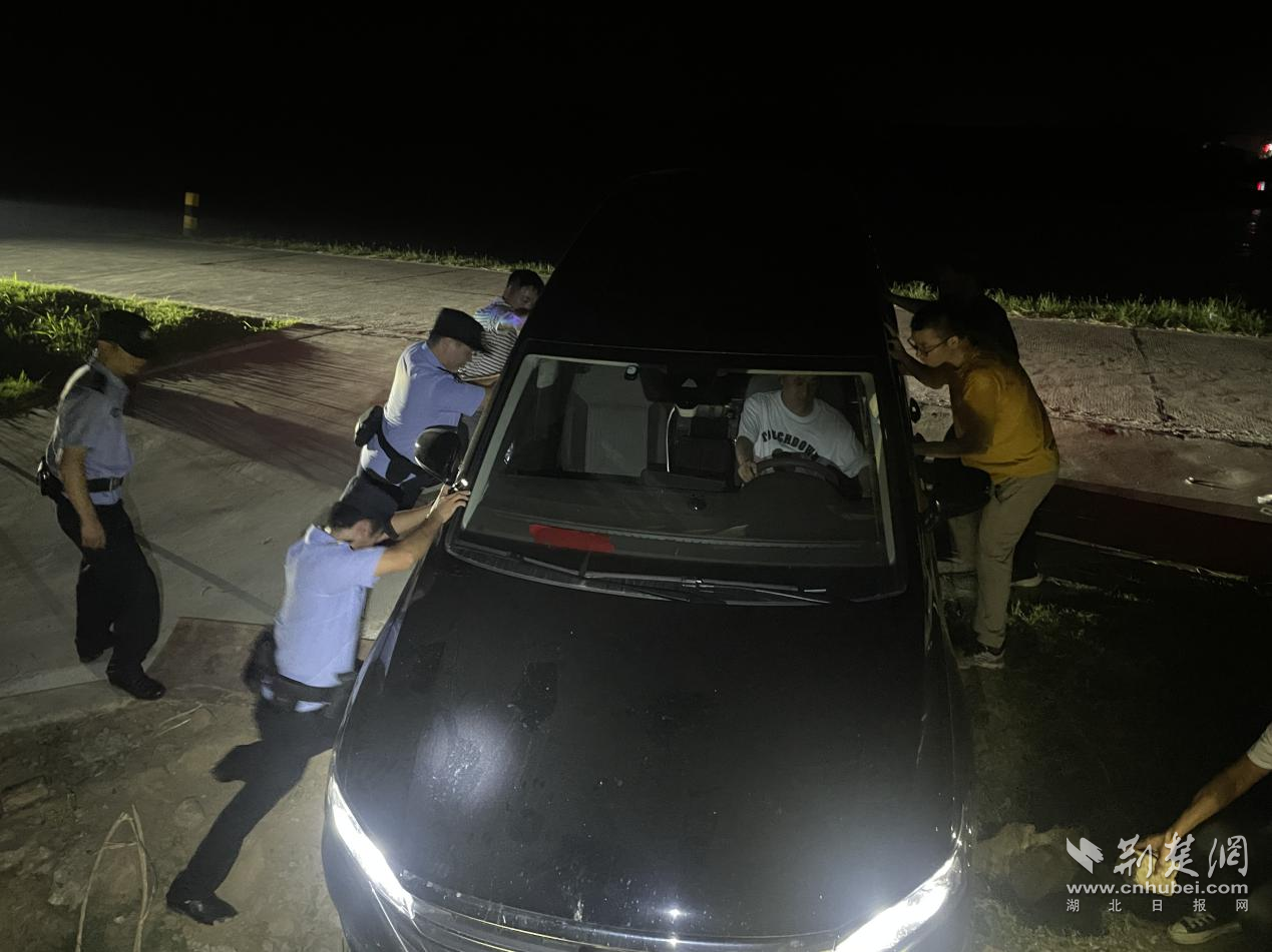 石首市公安局民輔警合力救助被卡車輛。通訊員供圖