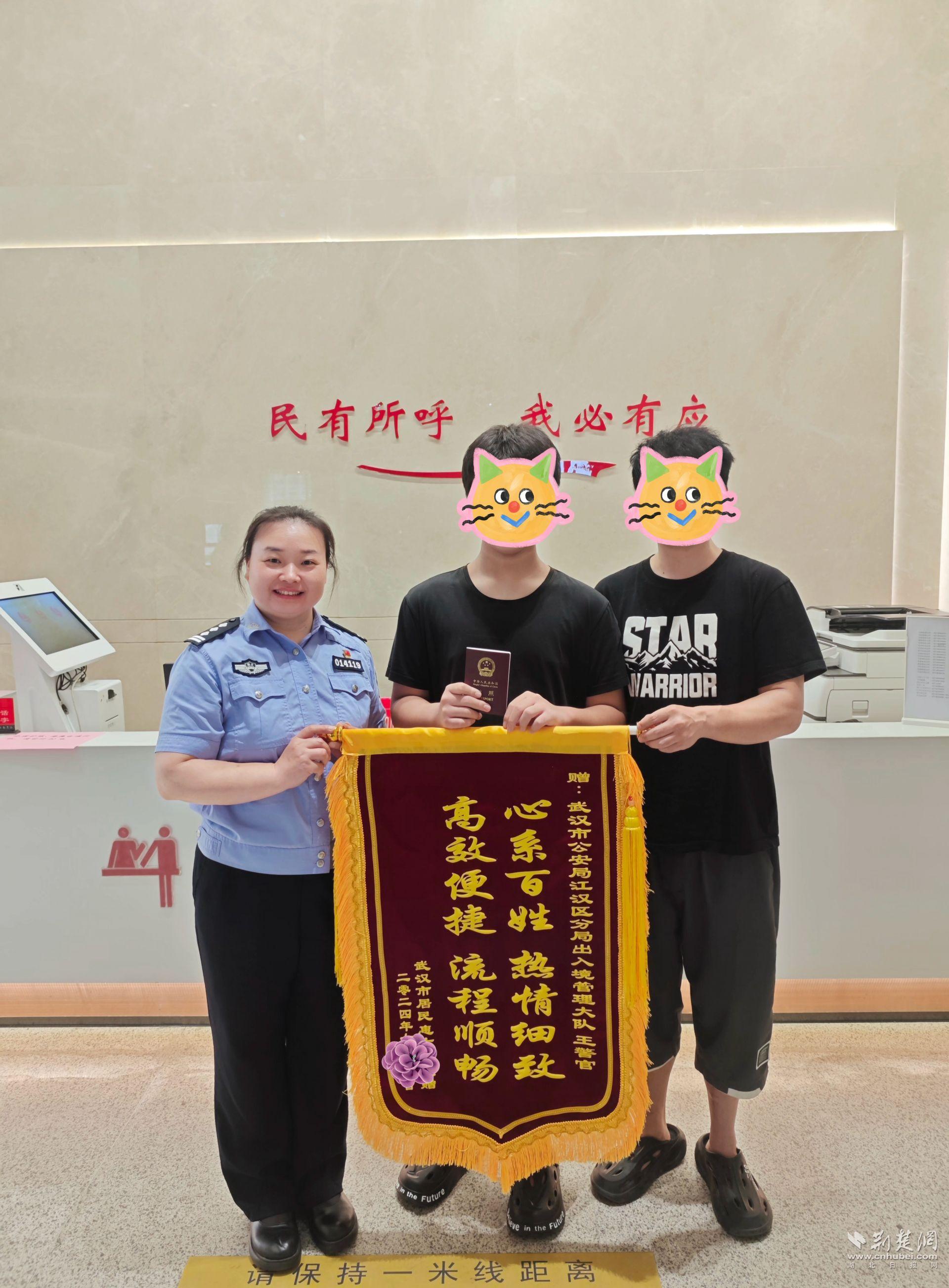 8月9日,惠奶奶一家旅行結束回漢,專程制作錦旗送到江漢公安出入境窗口,為“江漢有禮”公安窗口竭盡全力為群眾解決燃眉之急、用實際行動詮釋“為人民服務”的錚錚誓言點贊。