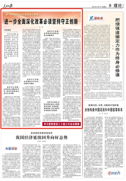 《決定》科學總結改革開放以來特別是新時代全面深化改革的寶貴經驗,提出進一步全面深化改革的重大原則,其中一條就是“堅持守正創新”。堅持守正創新,深刻體現馬克思主義思想方法和工作方法的內在要求。在進一步全面深化改革中堅持守正創新,必須堅持中國特色社會主義不動搖,緊跟時代步伐,順應實踐發展,突出問題導向,在新的起點上推進理論創新、實踐創新、制度創新、文化創新以及其他各方面創新。【全文】
