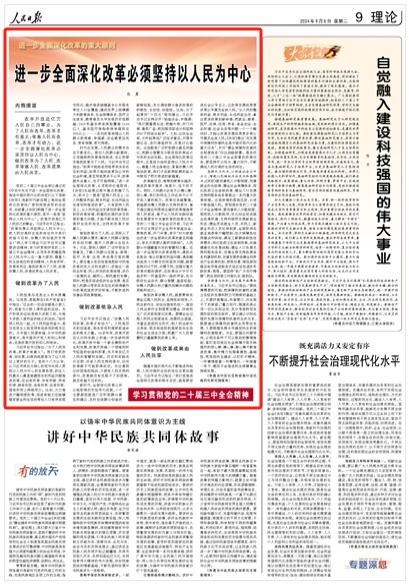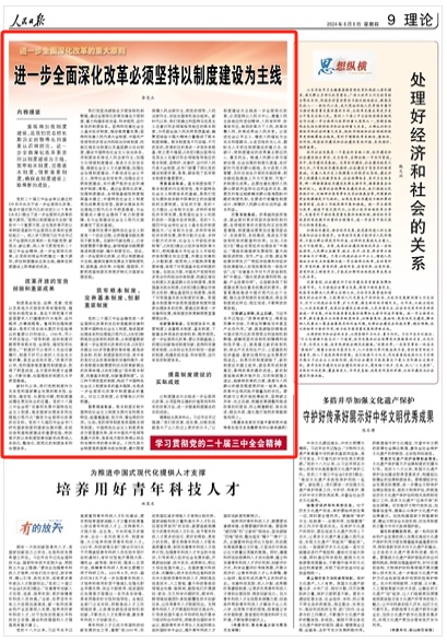黨的二十屆三中全會審議通過的《中共中央關于進一步全面深化改革、推進中國式現代化的決定》(以下簡稱《決定》)是新時代新征程上推動全面深化改革向廣度和深度進軍的總動員、總部署。《決定》明確進一步全面深化改革要貫徹堅持黨的全面領導、堅持以人民為中心、堅持守正創新、堅持以制度建設為主線、堅持全面依法治國、堅持系統觀念等原則?!傲鶄€堅持”的重大原則對于進一步全面深化改革具有重大指導意義,必須長期堅持,認真貫徹落實。