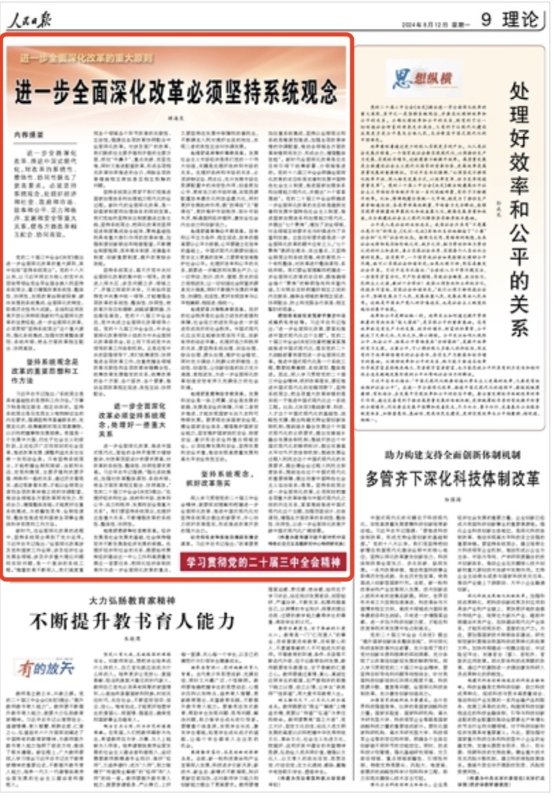 《決定》提出進一步全面深化改革的重大原則,其中包括“堅持系統觀念”。進一步全面深化改革、推進中國式現代化,對改革的系統性、整體性、協同性提出了更高要求。必須堅持系統觀念,處理好經濟和社會、政府和市場、效率和公平、活力和秩序、發展和安全等重大關系,使各方面改革相互配合、協同高效。【全文】