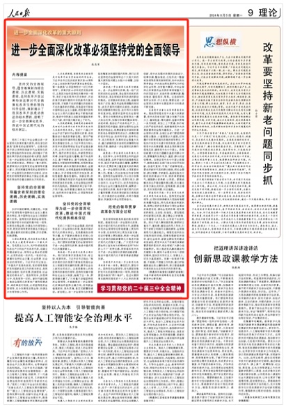 黨的二十屆三中全會提出進一步全面深化改革的重大原則,排在首位的就是“堅持黨的全面領導”。這是對改革開放以來特別是新時代全面深化改革寶貴經驗的科學總結,深刻揭示了我國改革開放成功推進的根本原因,指明了進一步全面深化改革、推進中國式現代化的根本保證。貫徹這一重大原則,就要深刻認識堅持黨的全面領導的重大意義,深刻把握堅持黨的全面領導與進一步全面深化改革的內在聯系,切實把黨的領導貫穿改革各方面全過程,確保改革始終沿著正確政治方向前進。【全文】