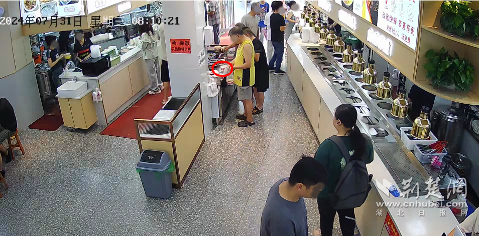 經查看視頻發現,當日8時9分,余先生將手機放在早點店調料臺轉身拿調料時,一身穿黑衣男子來到調料臺前,用碗蓋在手機上,等身邊人走后將手機拿出夾在腋下迅速離開。