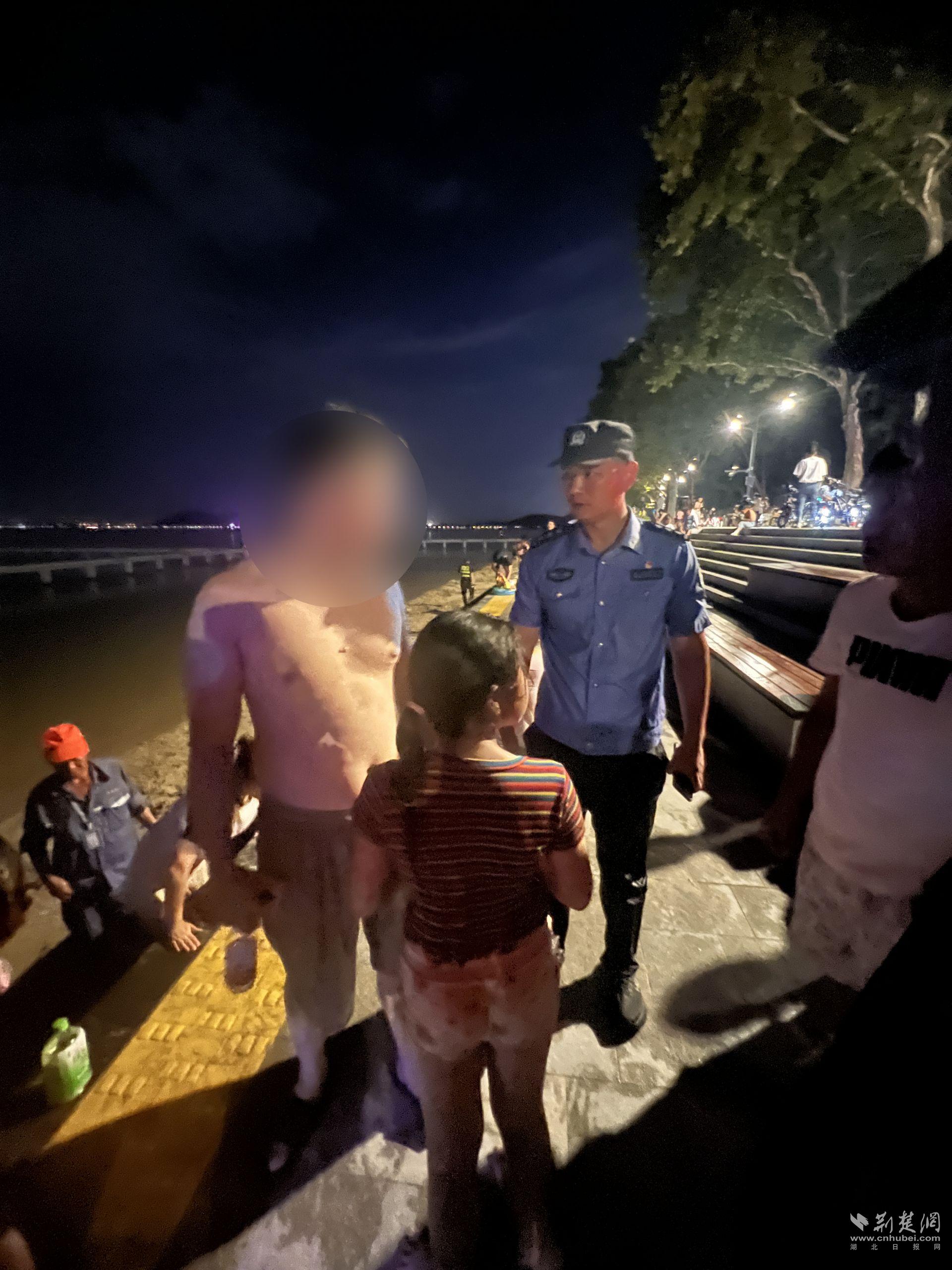 8月12日20時30分許,東湖公安分局巡特警大隊民警幸鑫帶領4名隊員正在東湖南路凌波門進行定點巡邏。“你們看,靠近湖心第二格的泳池內是不是有人在撲騰水?”此時天色已晚,湖面光線條件不佳,于是幸鑫帶領隊員跑上棧道靠近觀察,發現一名兒童身體大部分沒入水中,手一會舉起來一會沉下去。