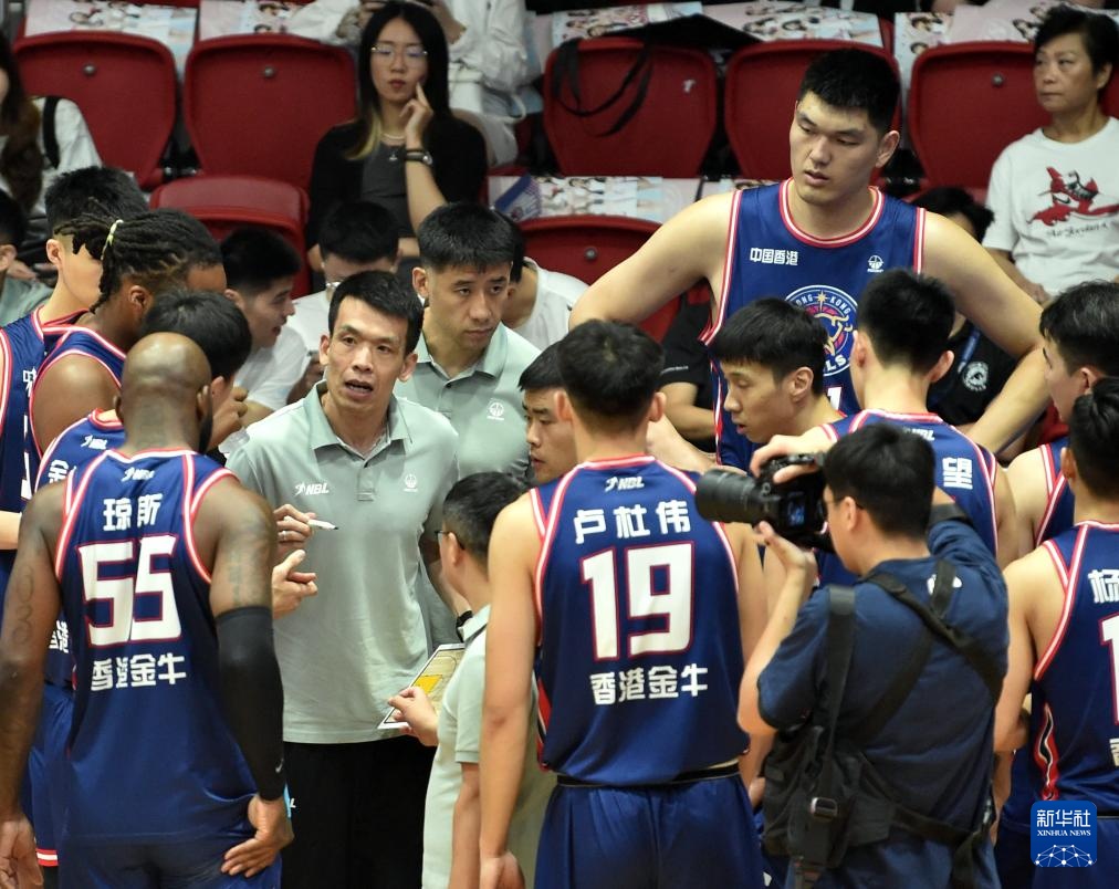 8月13日,香港金牛隊主教練解立彬(前中)在比賽間隙布置戰術。新華社記者 盧炳輝 攝
