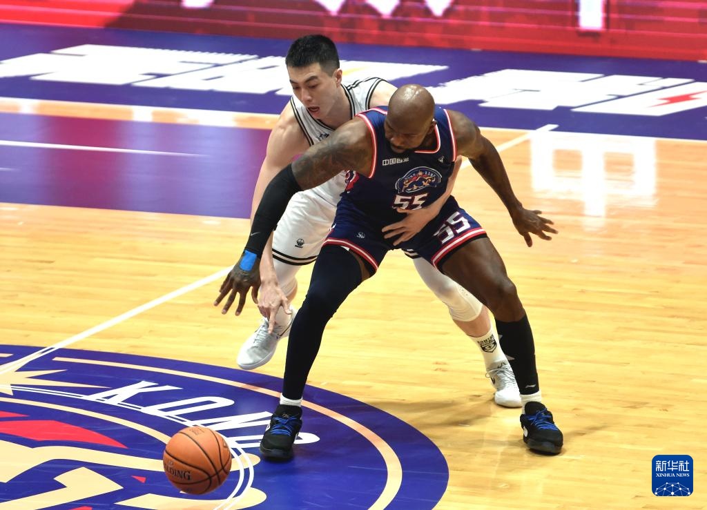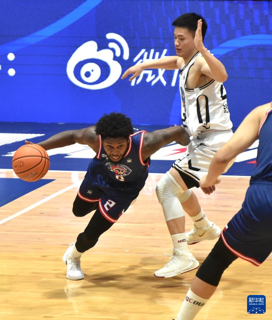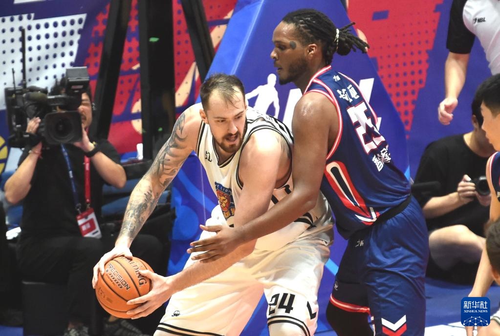 8月13日,香港金牛隊球員約書亞·卡爾頓(右)在比賽中防守江蘇湯溝國藏隊球員昂德雷·巴爾文。新華社記者 盧炳輝 攝