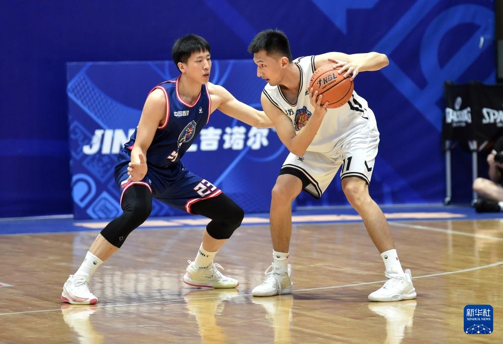 8月13日,香港金牛隊球員余柏林(左)在比賽中防守江蘇湯溝國藏隊球員沈子然。新華社記者 盧炳輝 攝