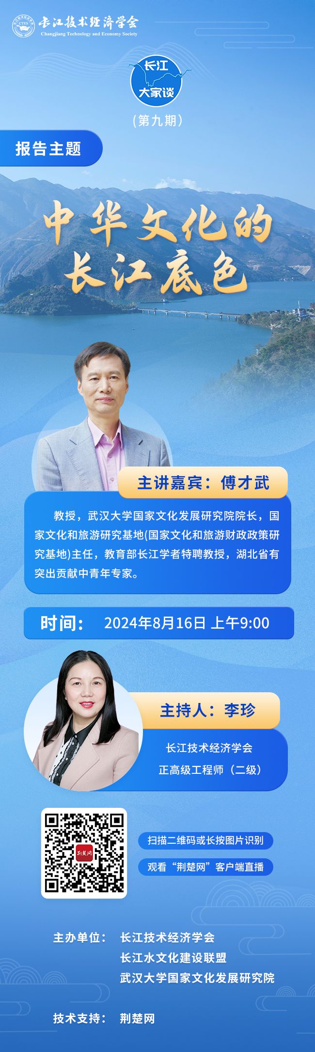 據(jù)悉,本期“長江?大家談”云講壇活動由長江技術(shù)經(jīng)濟(jì)學(xué)會、長江水文化建設(shè)聯(lián)盟、武漢大學(xué)國家文化發(fā)展研究院主辦,特邀武漢大學(xué)傅才武教授作主題報告分享。