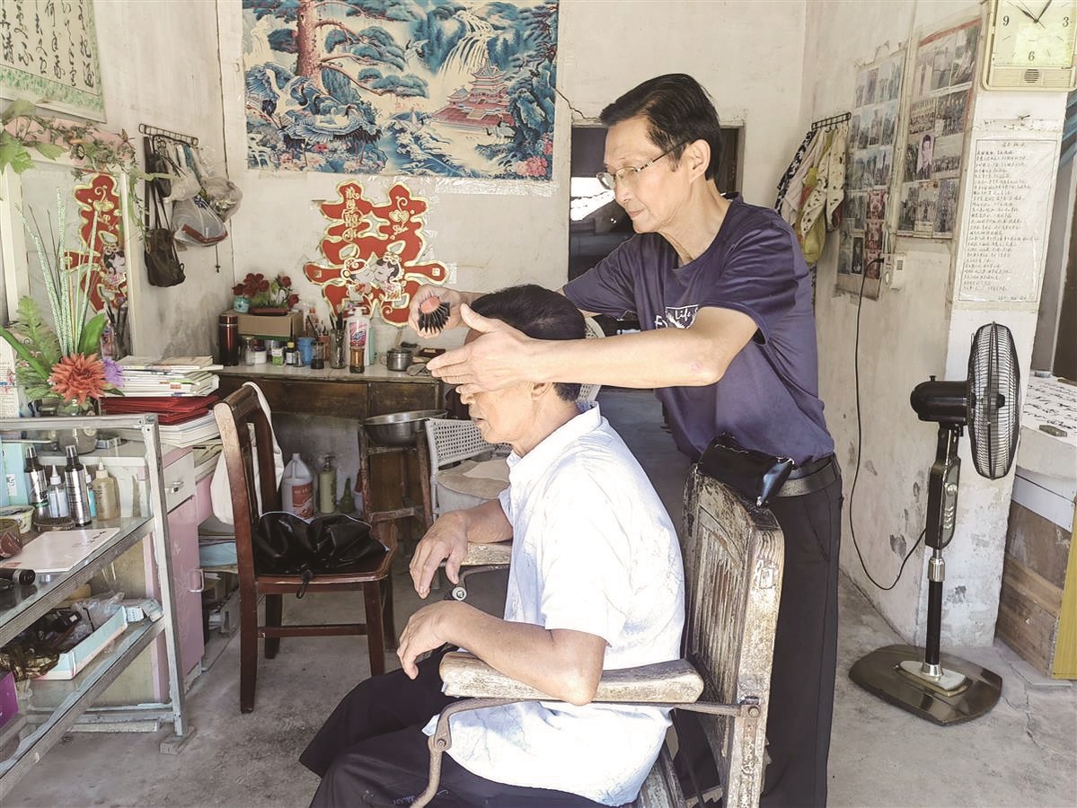 “嚓嚓,嚓嚓……”8月15日,林詠正手持理發剪,專注地為顧客服務。他動作嫻熟利落,店里只有剪刀與發絲觸碰的聲音。理發椅旁,隨手可拿起的除了剪刀,還有堆積如山的詩詞歌賦格律書。76歲的他,精氣神十足。