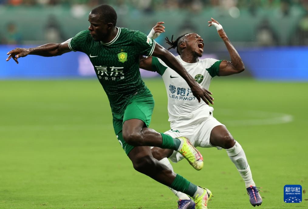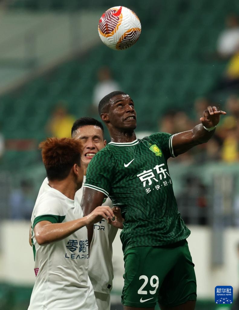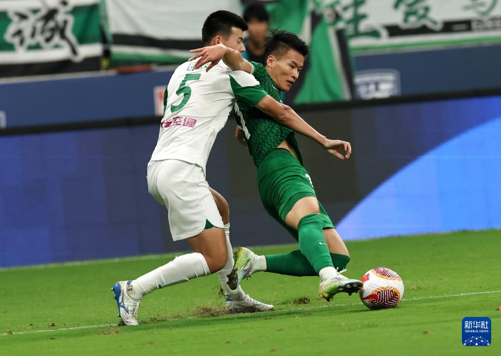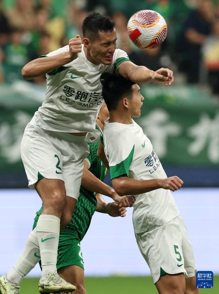 8月16日,北京國安隊(duì)球員林良銘(右)與浙江隊(duì)球員劉浩帆在比賽中拼搶。