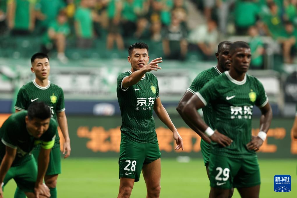 8月16日,北京國安隊(duì)球員張呈棟(中)在比賽中指揮隊(duì)友。