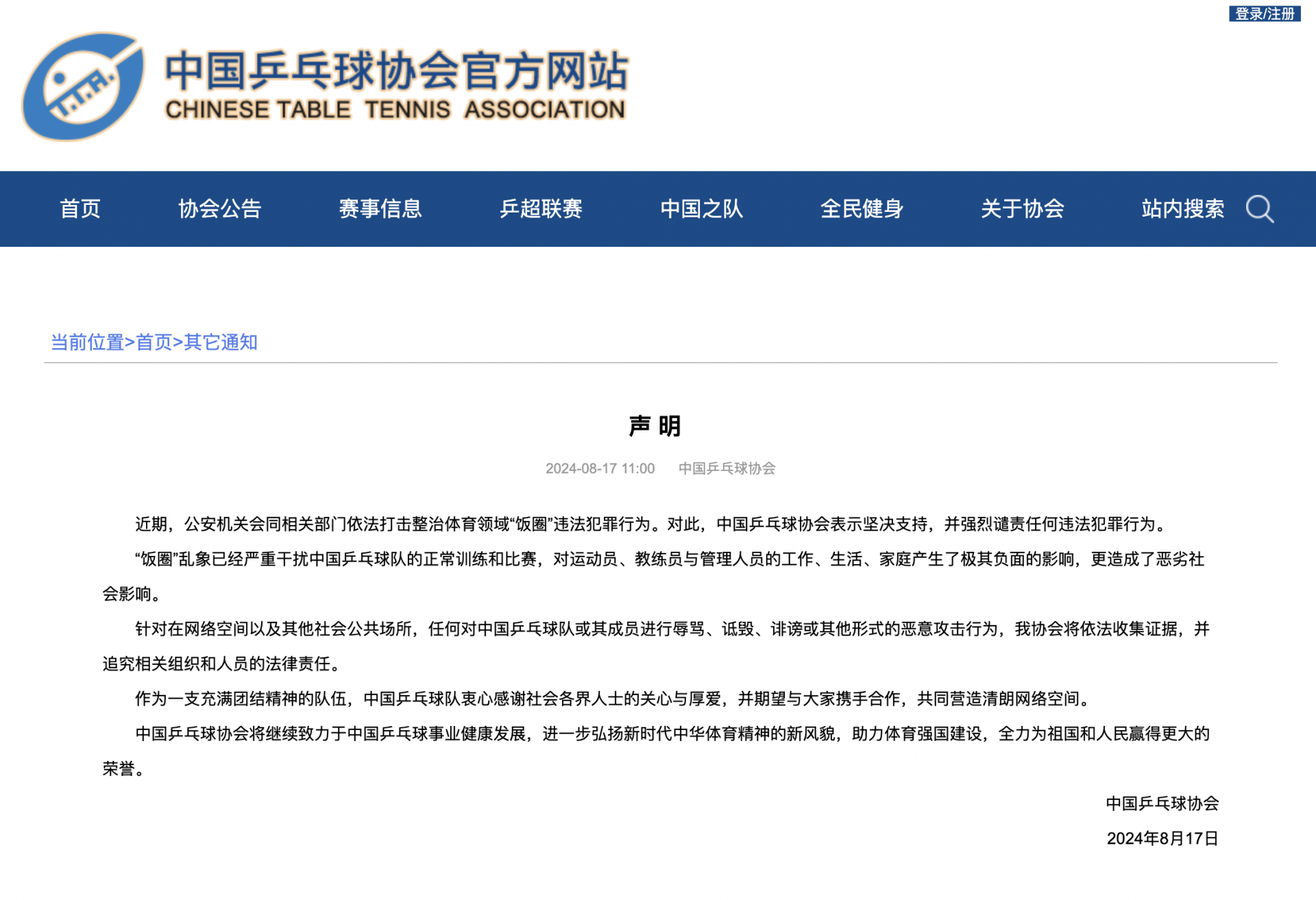 近期,公安機關會同相關部門依法打擊整治體育領域“飯圈”違法犯罪行為。對此,中國乒乓球協會8月17日在官網發布聲明表示堅決支持,并強烈譴責任何違法犯罪行為。