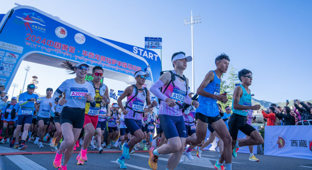 8月17日,2024拉薩半程馬拉松參賽選手從起點(diǎn)出發(fā)。新華社記者 丁增尼達(dá) 攝