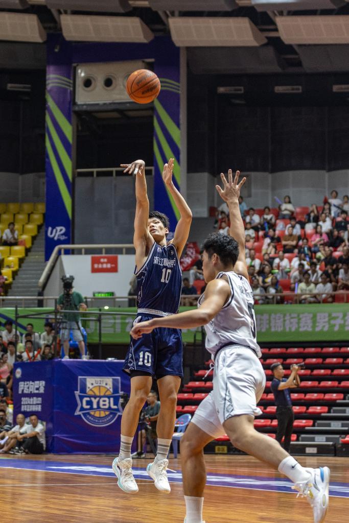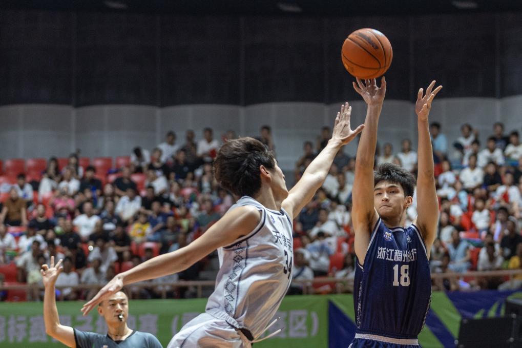 8月18日,浙江稠州銀行隊球員景天雨(右)在比賽中投籃。新華社記者 黃偉 攝