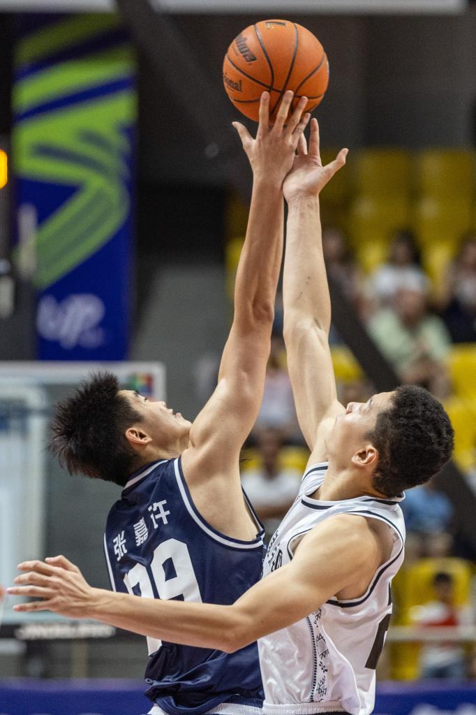8月18日,浙江稠州銀行隊球員張嘉許(左)與天津榮鋼隊球員李宗霖在比賽中跳球。新華社記者 黃偉 攝
