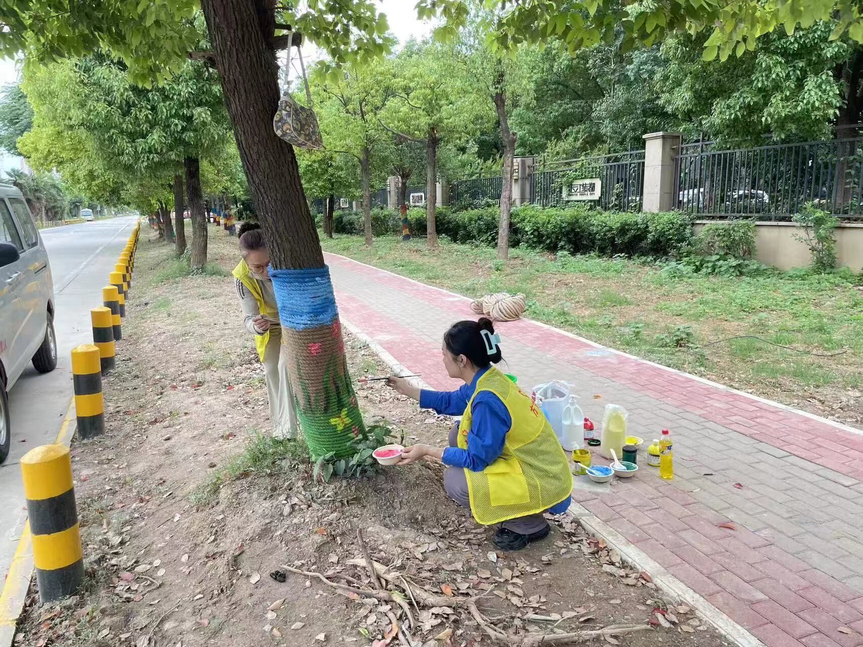 志愿者正在給樹木彩繪