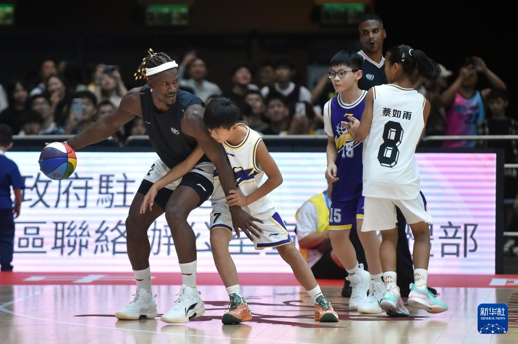 8月20日,國際籃球明星隊球員吉米·巴特勒(左一)與小球員互動。新華社記者 盧炳輝 攝