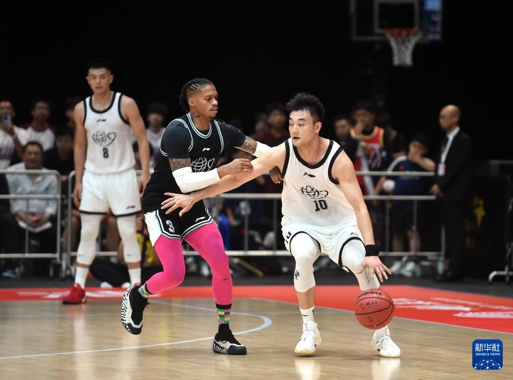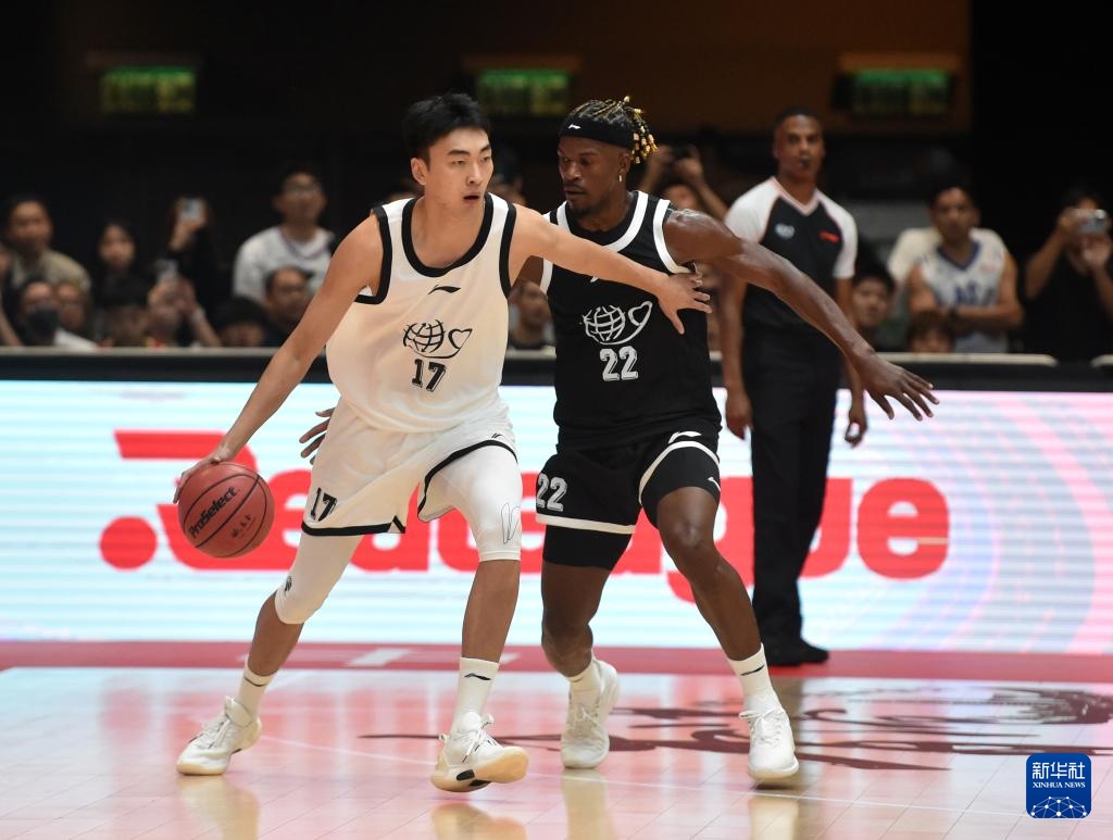 8月20日,國際籃球明星隊球員吉米·巴特勒(右)防守中國籃球明星隊球員劉雁宇。新華社記者 盧炳輝 攝
