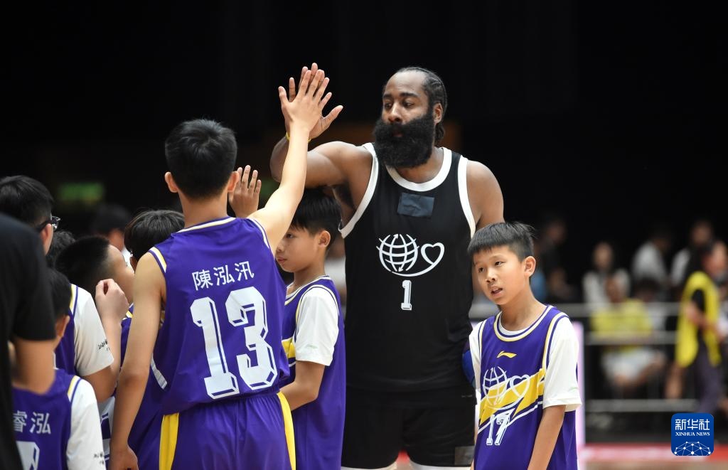8月20日,國際籃球明星隊球員哈登(右二)與小球員擊掌。新華社記者 盧炳輝 攝