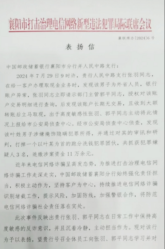8月1日,郵儲銀行襄陽市人民中路支行收到襄陽市打擊治理電信詐騙工作協調機制辦公室的感謝信,對該行打擊治理電信網絡詐騙工作表示充分肯定及贊揚。