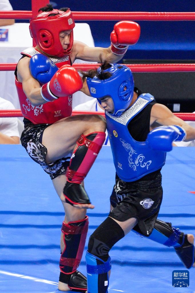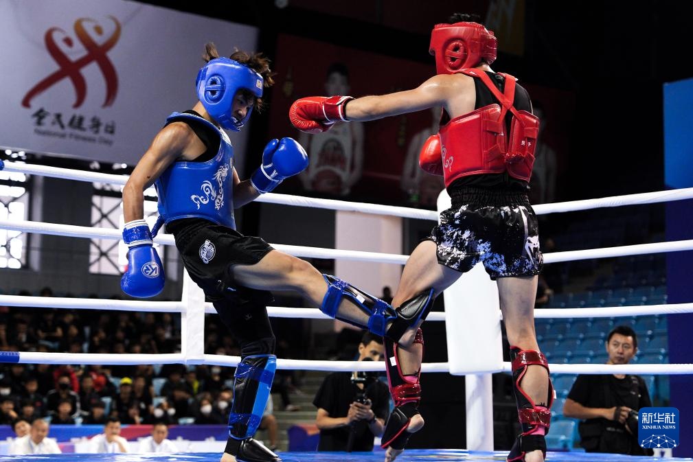 8月22日,振中搏擊隊(duì)選手付鑫(藍(lán)色)與功夫榮耀隊(duì)選手孫錢程(紅色)在男子K1組57公斤級(jí)比賽中。新華社記者 許暢 攝