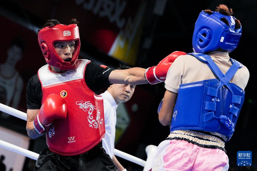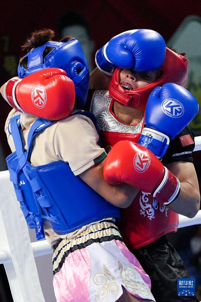 8月22日,陜西青奧隊(duì)選手王玉輝(左)與貴陽(yáng)博克斯隊(duì)選手劉庭坤在男子K1組57公斤級(jí)比賽中。新華社記者 許暢 攝