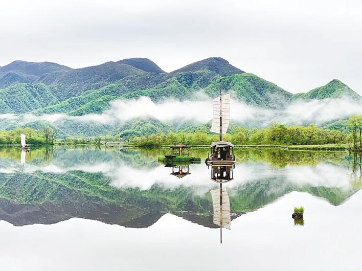 大九湖水天一色風景優美。(湖北日報通訊員 龔平 攝)