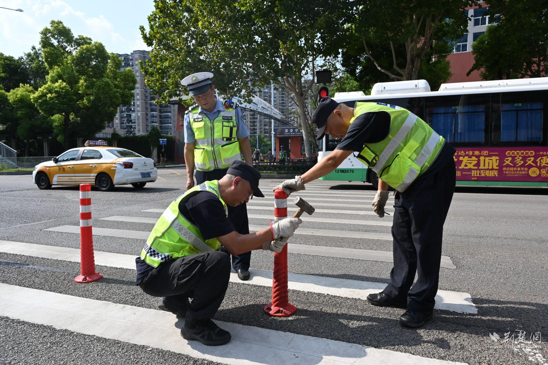 8月 22 日下午,江岸區分局百步亭派出所民警沈勝文、王玥琪對轄區漢鐵高級中學的校園封閉管理、消防設施、安防裝備、專職保安員配備等情況進行逐條逐項檢查,對出入校園登記信息不全問題,現場督導校方及時整改。當天,丹水池警務站的民警也來到該校,組織學校保安隊開展技能培訓和突發事件應急演練,江岸區交通大隊五中隊民警則對該校門前的反光錐桶、指示標牌等交通設施進行了檢查、維護。