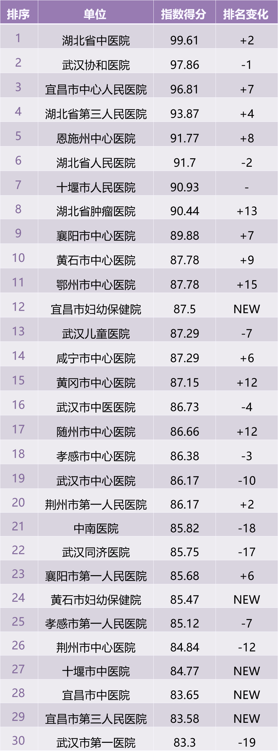 7月,湖北省第三人民醫院和恩施州中心醫院本月排名前五,排名前十的醫院還有湖北省人民醫院、十堰市人民醫院、湖北省腫瘤醫院、襄陽市中心醫院和黃石市中心醫院。此外,進入前三十名的醫院還有鄂州市中心醫院、宜昌市婦幼保健院、武漢兒童醫院、咸寧市中心醫院、黃岡市中心醫院、武漢市中醫醫院、隨州市中心醫院、孝感市中心醫院、武漢市中心醫院、荊州市第一人民醫院等。