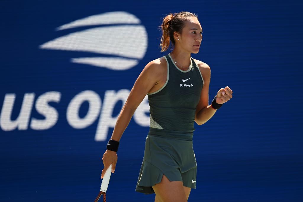 8月26日,鄭欽文在比賽中慶祝得分。新華社記者 李睿 攝