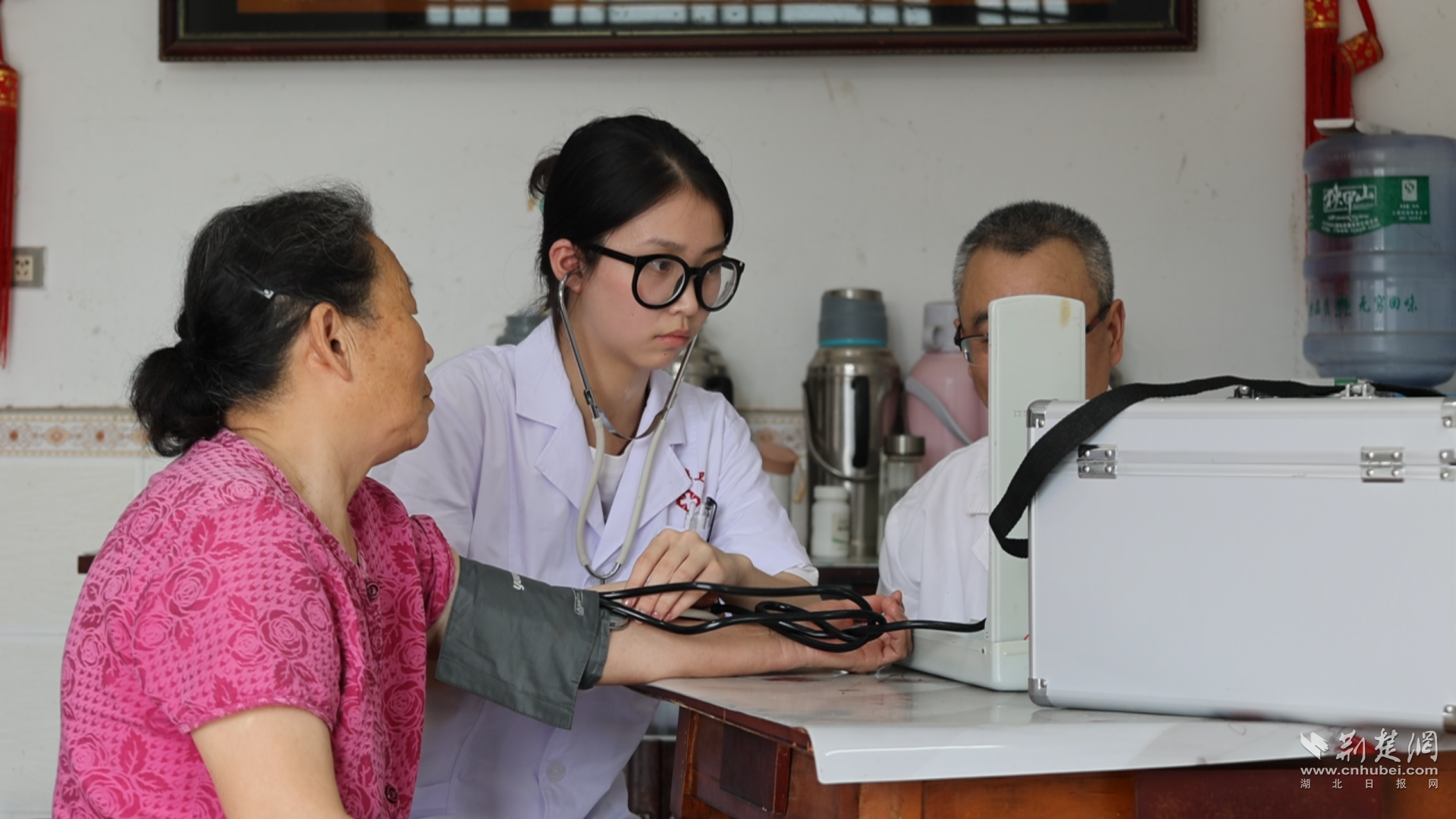 8月盛夏,烈陽當頭。荊州市公安縣毛家港鎮新曙光村,即將正式走上工作崗位的大學生村醫郝甜在“師父”魏福國的帶領下,來到劉奶奶家上門隨訪。剛20歲出頭的“小丫頭”郝甜,熟練地為老人測量血壓,叮囑老人按時吃藥、注意飲食。